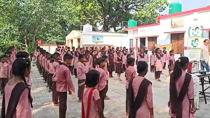 पी टी करते हुए उ प्रा वि मझियावां सिद्धौर बाराबंकी उत्तर प्रदेश के बच्चे।