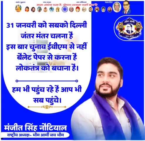 ईवीएम से नही बैलेट पेपर से चुनाव होगा। 31 जनवरी को आप सभी दिल्ली जंतर मंतर पहुंचे। हम सब भी पहुंच रहे है। मनजीत सिंह नौटियाल भीम आर्मी जय भीम राष्ट्रीय अध्यक्ष