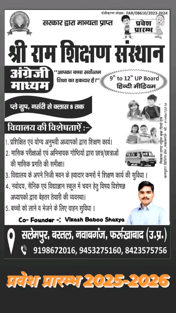 अच्छी शिक्षा बेहतर शिक्षा के लिए अपने बच्चों का एडमिशन श्री राम शिक्षण संस्थान सलेमपुर नवाबगंज फर्रूखाबाद में कराएं । प्रवेश प्रारम्भ हो गए हैं।