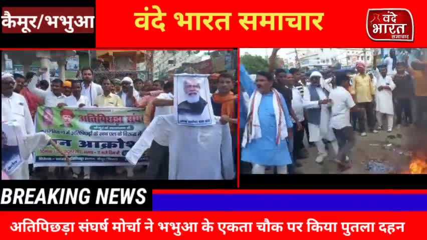 अधौरा: kaimur:अतिपिछड़ा संघर्ष मोर्चा ने भभुआ के एकता चौक पर हाई कोर्ट के न्यायधीश और PM नरेंद्र मोदी का किया पुतला दहन ।