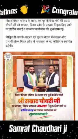 Hearty congratulations to Bihar Legislative Council member and former cabinet minister Mr. Samrat Chowdhary ............