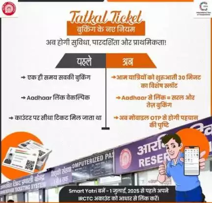 Tatkal टिकट बुकिंग प्रक्रिया को और अधिक पारदर्शी, सुरक्षित एवं सुविधाजनक बनाने के लिए रेलवे द्वारा नए नियम लागू।🚊📷 अब आम यात्रियों को प्राथमिकता मिलेगी, पहचान की पुष्टि होगी सटीक - और बुकिंग अनुभव होगा और भी बेहतर।📷#TatkalTicket #IRCTC