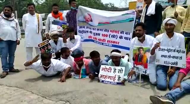 बढ़ती महंगाई को लेकर आज NSUI कार्यकर्ताओं के साथ गौरीगंज मुख्यालय पर प्रदर्शन करते हुए सौरभ मिश्र NSUI अध्यक्ष अमेठी