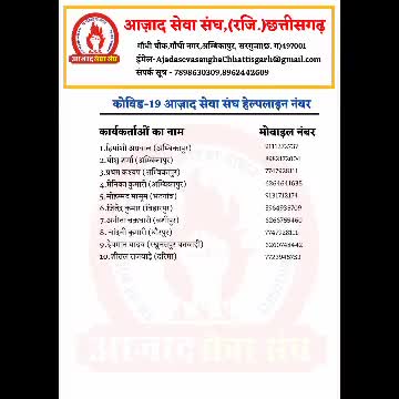 आजाद सेवा संघ-10 लोगों की सूची तैयार की गई है कोविड-19 के संबंध में कोई समस्या हो तो सकंपर्क करे। 7747928111🙏