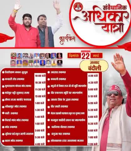 कल 22/03/2025 को जनपद चंदौली में पहुँचेगी निषाद पार्टी की संवैधानिक अधिकार न्याय यात्रा आप सादर आमंत्रित हैं