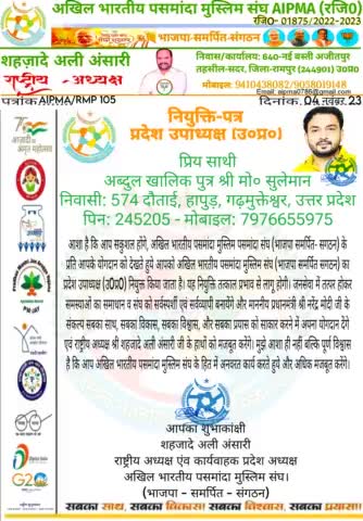 अखिल भारतीय पसमांदा मुस्लिम संघ (भाजपा-समर्पित-संगठन) के राष्ट्रीय अध्यक्ष एवं कार्यवाहक प्रदेशाध्यक्ष शहज़ादे अली अंसारी ने जनपद-हापुड़ निवासी अब्दुल खालिक राजपूत को उत्तर प्रदेश के प्रदेश-उपाध्यक्ष पद पर नियुक्त किया है।