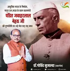 आधुनिक भारत के निर्माता, आजाद भारत के प्रथम प्रधानमंत्री व भारत रत्न पं. जवाहरलाल नेहरू जी की पुण्यतिथि पर शत-शत नमन ।। डॉ गोविंद मुजाल्दा