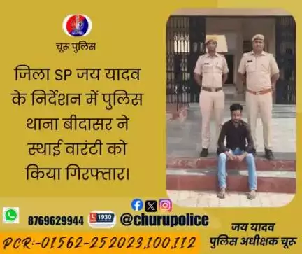 #churupolice जिला SP जय यादव के निर्देशन में पुलिस थाना बीदासर ने स्थाई वारंटी को किया गिरफ्तार।