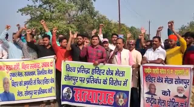 सोनपुर मेला से प्रतिबंध हटाने के लिए प्रदर्शन करते सामाजिक कार्यकर्ता आलोक आजाद