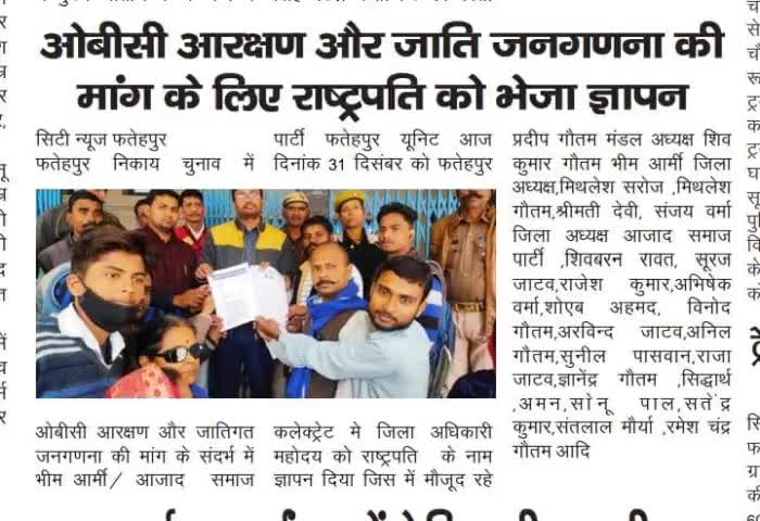 निकाय चुनाव मे OBC आरक्षण व जातिगत जनगणना को लेकर फतेहपुर मे राष्ट्रपति महोदया के नाम जिलाधिकारी को ज्ञापन