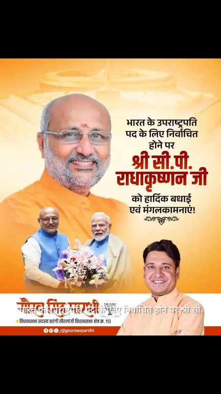 भारत के उपराष्ट्रपति पद के लिए निर्वाचित होने पर श्री सी.पी. राधाकृष्णन जी को हार्दिक बधाई एवं मंगलकामनाएं! *गौरव सिंह पारधी* *विधानसभा सदस्य, कटंगी खैरलांजी*