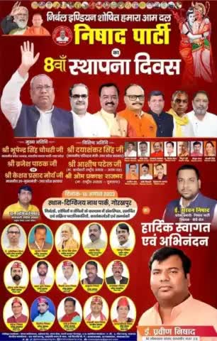 16 अगस्त को निषाद पार्टी का स्थापना दिवस समारोह गोरखपुर में मनाया जा रहा है आप सभी सादर आमंत्रित हैं जय निषाद राज