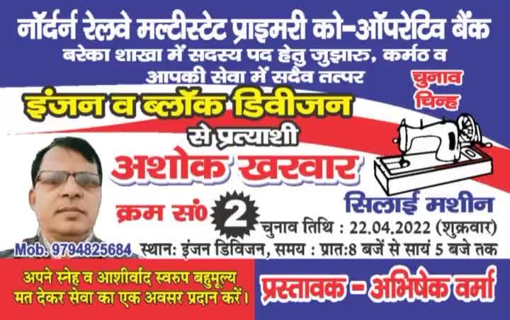 नॉर्दर्न रेलवे मल्टीस्टेट प्राइ०को-ऑप०बैंक बरेका वारा०के ब्लॉक डिवि०के लिए सिलाई मशीन पर मुहर लगाएं अशोक खरवार को जिताएं