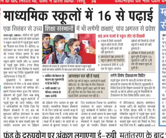 उत्तर प्रदेश माध्यमिक स्कूलों में 16 से पढ़ाई