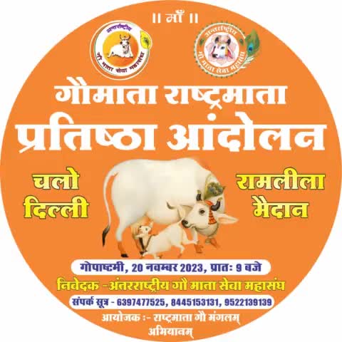 हम सब मिलकर गौ माता को राष्ट्रमाता प्रतिष्ठा आंदोलन 20 नवंबर 2023 रामलीला ग्राउंड दिल्ली में अपनी सहभागिता बढ़ाएं और गौ माता जी को सम्मान दिलाए निवेदक, अंतर्राष्ट्रीय गौ माता सेवा महासंघ