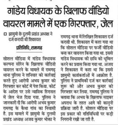 गांडेय विधायक कल्पना सोरेन मुर्मू के खिलाफ़ वीडियो वायरल में एक युवक गिरफ्तार! #ramgarh #policeupdate