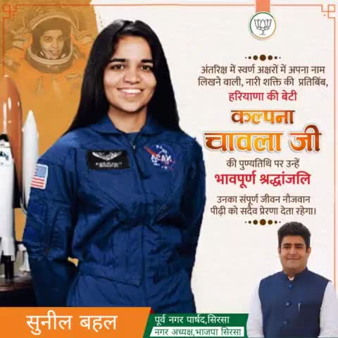 अंतरिक्ष में स्वर्ण अक्षरों से अपना नाम लिखने वाली,नारी शक्ति की प्रतिबिंब,हरियाणा की बेटी कल्पना चावला जी की पुण्यतिथि पर उन्हें भावपूर्ण श्रद्धांजलि।उनका संपूर्ण जीवन नौजवान पीढ़ी को सदैव प्रेरणा देता रहेगा।