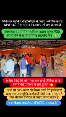 मधुबनी:-लदनियाँ प्रखंड के पद्मा पंचायत में सिर्फ चार महीने में 20 क्विंटल से ज्यादा अजैविक कचरा WPU घर मे स्टॉक हो गया