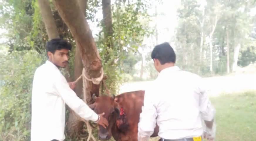 ग्राम बल्लाशेरपुर में एक गोवंश को किसी अज्ञात व्यक्ति द्वारा घायल कर दिया गया मौके पर बजरंग दल के कार्यकर्ताओं ने उपचार