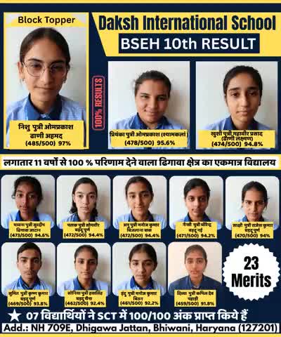 हरियाणा विद्यालय शिक्षा बोर्ड द्वारा जारी किए गए दसवीं के परिणाम में हमारे विद्यालय दक्ष इंटरनेशनल स्कूल का परिणाम 100 प्रतिशत रहा, जिसमें निशु पुत्री ओमप्रकाश गांव ढाणी अहमद ने 500 में से 485 अंक प्राप्त कर ब्लॉक टॉप किया।