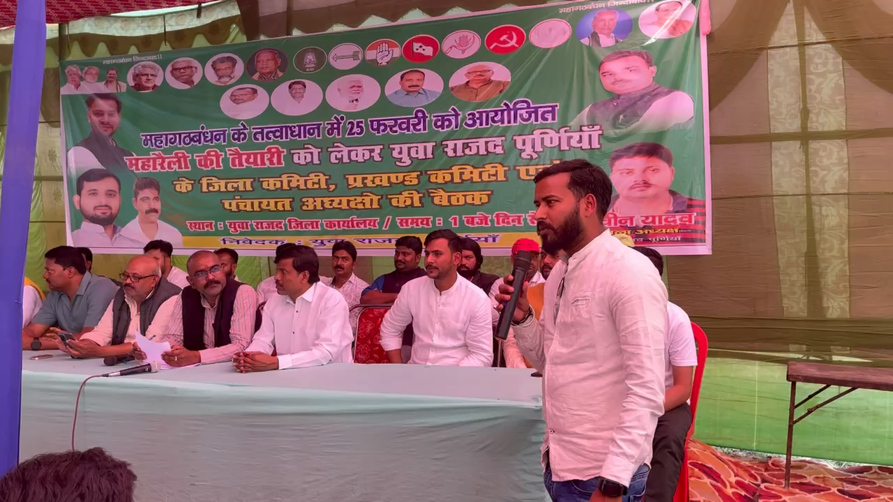 पूर्णिया पूर्व: महागठबंधन द्वारा आयोजित 25 फरवरी को महारैली में युवा राजद पूर्णिया के एक दिवसीय बैठक मै छात्र राजद का आवाज बुलंद करते हुए।