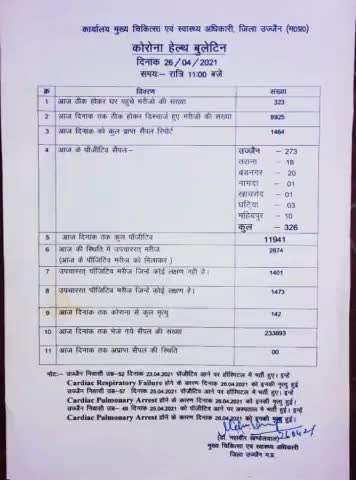 *कोरोना हेल्थ बुलेटिन जिला उज्जैन* *26-04-2021* रात्रि 11:00 *आज आई रिपोट में कुल 326 संक्रमित मिले है।*