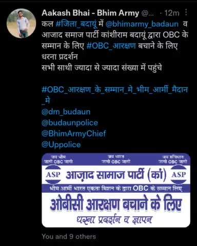 कल #जिला_बदायूं में भीम आर्मी व ASP बदायूं द्वारा OBC आरक्षण के सम्मान में धरना प्रदर्शन व ज्ञापन सौंपा जाएगा