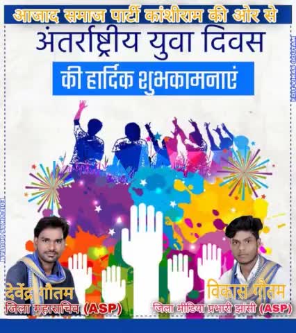 सभी युवाओं को अंतर्राष्ट्रीय युवा दिवस की हार्दिक बधाई एवं शुभकामनाएं। विकास गौतम जिला मीडिया प्रभारी झांसी