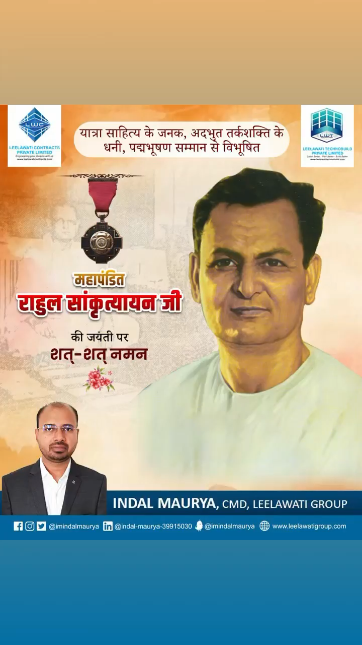 यात्रा साहित्य के जनक, अदभुत तर्कशक्ति के धनी, पद्मभूषण सम्मान से विभूषित महापंडित राहुल सांकृत्यायन जी की जयंती पर शत्-शत् नमन ।