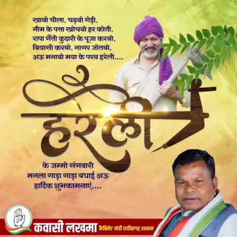 हरियर-हरियर दिखत हे संगी, चारो कोती खेतीखार। आगे संगी हमर छत्तीसगढ़ के, पहिली हरेली तिहार। जम्मो किसान, भाई-बहिनी मन ल छत्तीसगढ़ के पहिला तिहार "हरेली" के गाड़ा-गाड़ा बधाई अउ शुभकामना।
