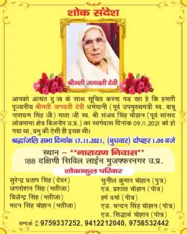 पुर्व उप मुख्यमंत्री स्व नारायण सिंह जी की धर्मपत्नी और चंदन भाई की दादी श्रीमती जगवती जी की आरिष्ठी शोकसभा मुजफ्फरनगर में होगी