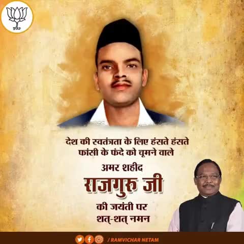 देश की स्वतंत्रता के लिए हसते हसते फांसी के फंदे को चूमने वाले अमर शहीद राजगुरु जी की जयंती पर शत् शत् नमन।