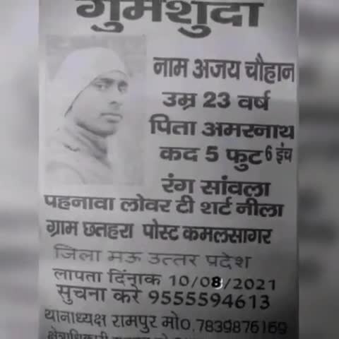 गुमशुदा : 7 दिनों से लापता गांव छतहरा पोस्ट कमलसागर ज़िला मऊ अजय चौहान का अभी तक नही लगा पता। #गुमशुदा