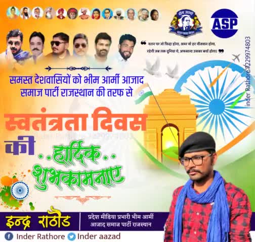 आप सभी देशवासियों को भीम आर्मी - आज़ाद समाज पार्टी (राजस्थान) की तरफ से स्वतंत्रता दिवस की हार्दिक बधाई.शुभकामनाएं.