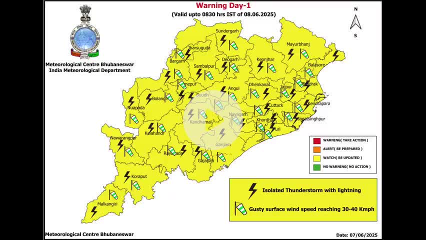 ଭୁବନେଶ୍ୱର ଆଞ୍ଚଳିକ ପାଣିପାଗ କେନ୍ଦ୍ର ପକ୍ଷରୁ କାଳବୈଶାଖୀ ପାଇଁ ୮ ତାରିଖ ସକାଳ ୮ ଟା ୩୦ ପର୍ଯ୍ୟନ୍ତ ଜିଲ୍ଲାଲୁ ୟେଲୋ ୱର୍ନିଙ୍ଗ କରାଯାଇଛି। ଏହି ସମୟ ମଧ୍ୟରେ ଜିଲ୍ଲାରେ ଘଡଘଡି, ବିଜୁଳି ସାଙ୍ଗକୁ ବର୍ଷା ହେବ ବୋଲି ସୂଚନା ଦିଆଯାଇଛି। ଏହା ସହ ଘଂଟାପ୍ରତି ୩୦ ରୁ ୪୦ କିଲୋମିଟର ବେଗରେ ପବନ ମଧ୍ୟ ବହିବ ବୋଲି ଭୁବନେଶ୍ବର ଆଞ୍ଚଳିକ ପାଣିପାଗ କେନ୍ଦ୍ର ପକ୍ଷରୁ ଆଜି ଦିନ ଗୋଟାଏ ସମୟରେ ସୂଚନା ଦିଆଯାଇଛି।