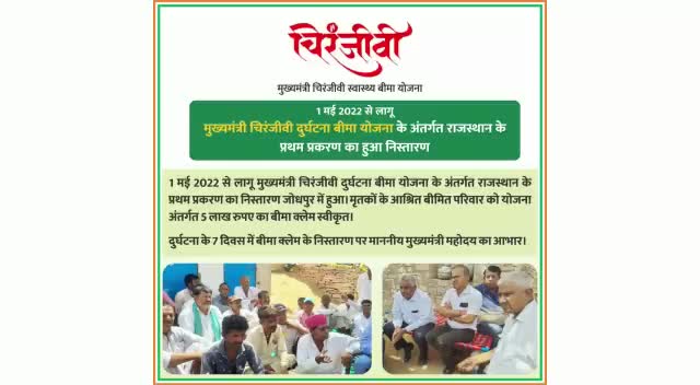 मुख्यमंत्री चिरंजीवी दुर्घटना बीमा योजना के अंतर्गत राजस्थान के प्रथम प्रकरण का निस्तारण माननीय मुख्यमंत्री महोदय के गृह जिले जोधपुर में हुआ।