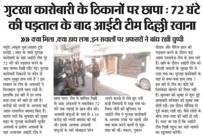 हरदोई : गुटखा कारोबारी के ठिकानों पर छापा : 72 घन्टें की पड़ताल के बाद आईटी टीम दिल्ली रवाना #newspaper