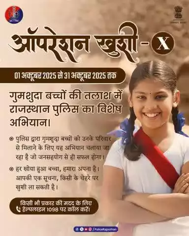 ऑपरेशन खुशी-10 राजस्थान पुलिस का गुमशुदा बच्चों की तलाश और पुनर्वास हेतु 01अक्टूबर से 31अक्टूबर 2025 तक विशेष अभियान।