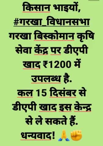 किसान भाईयों, #गरखा_विधानसभा गरखा बिस्कोमान कृषि सेवा केन्द्र पर डीएपी खाद ₹1200 में एक पैकेट उपलब्ध है. कल 15 दिसंबर से ले सकते हैं.🙏✊