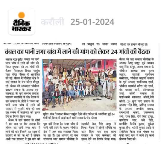 चंबल का पानी जगर बांध में लाने के लिए सर्व समाज चौबीसा की हुई बैठक सर्व समाज मिलकर कलेक्टर को ज्ञापन सौंपेगा नाहर सिंह