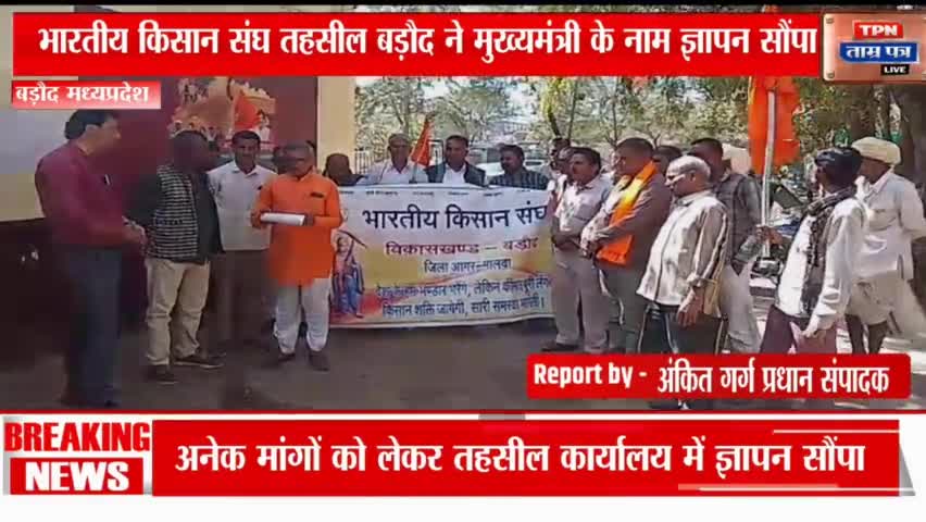 बड़ौद में भारतीय किसान संघ तहसील बड़ौद द्वारा मुख्यमंत्री के नाम विभिन्न मांगों को लेकर तहसील कार्यालय में ज्ञापन सौंपा