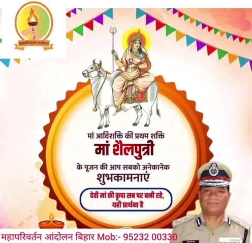 ॐ देवी शैलपुत्र्यै नमः मां आदिशक्ति की प्रथम शक्ति, मां शैलपुत्री के पूजन की आप सभी को अनेकानेक शुभकामनाएं! मां शैलपुत्री से प्रार्थना है कि सभी की मनोकामनाएं पूर्ण करें। जय माता दी! 🌺🙏 महापरिवर्तन आंदोलन बिहार प्रेरणा स्त्राेत:-पूर्व आईपीएस अधिकारी विनय कुमार सिंह Mob:- 9523200330