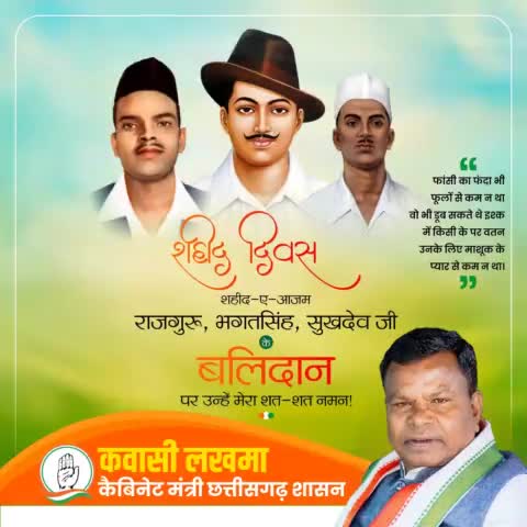 "राख का हर एक कण मेरी गर्मी से गतिमान है, मैं एक ऐसा पागल हूँ,जो जेल में भी आजाद है"। अमर शहीद भगत सिंह ,राजगुरु और सुखदेव जी के बलिदान दिवस पर उन्हें कोटि-कोटि नमन।