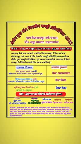 नौतनवां :-क्षेत्रीय युवा कबड्डी प्रतियोगिता का भव्य आयोजन किया जा रहा है। संपर्क सूत्र:- +916387898214, 8810882995