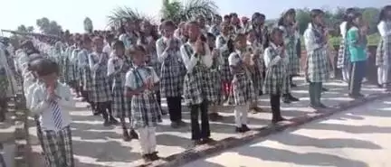 संत श्री आत्माराम पब्लिक स्कूल के बच्चे प्रार्थना में प्रतिभा करते हुए।