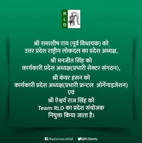रामाशीष राय जी राष्ट्रीय लोकदल उत्तर प्रदेश के नए प्रदेश अध्यक्ष, ऐश्वर्या राज सिंह टीम RLD के प्रदेश संयोजक नियुक्त।