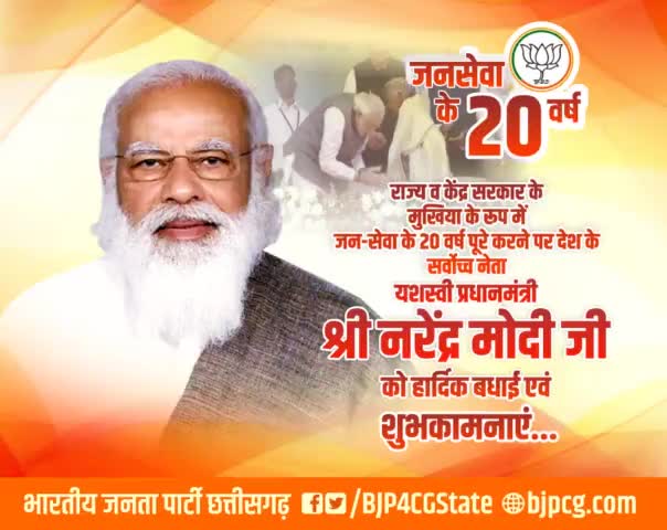 राज्य व केंद्र सरकार के मुखिया के रूप में जन-सेवा के 20 वर्ष पूरे करने पर देश के सर्वोच्च नेता यशस्वी प्रधानमंत्री श्री @narendramodi जी को हार्दिक बधाई एवं शुभकामनाएं। #20YearsofSevaSamarpan