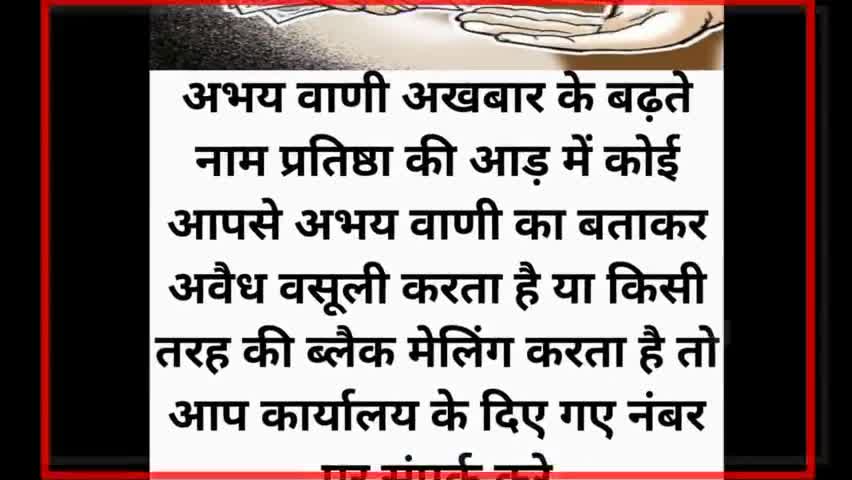 अभय वाणी अखबार के नाम पर अवैध वशूली या ब्लैक मेलिंग कोई करता है तो आप कार्यालय के नंबर पर संपर्क करे 9074300500