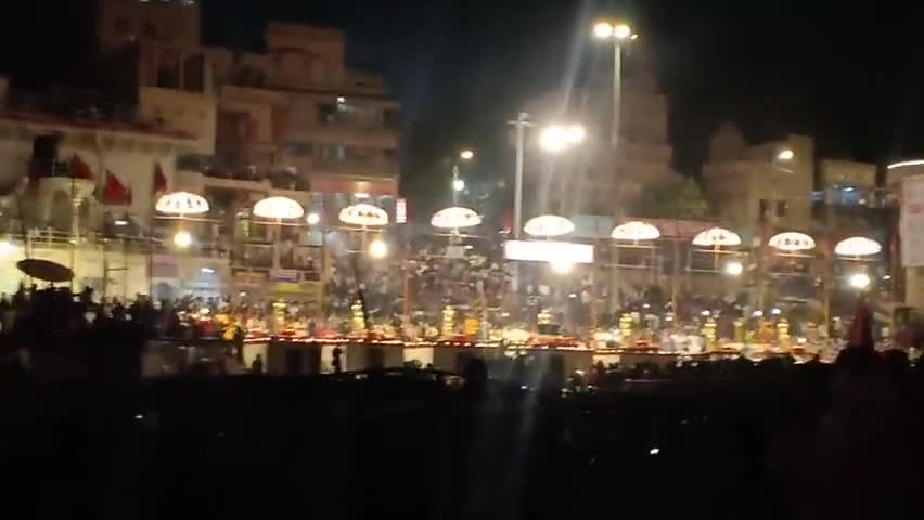 बनारस में हो रही गंगा आरती इस आरती को देखने के लिए दूर दूर से लोग आते हैं आप भी देखकर आनंद लें