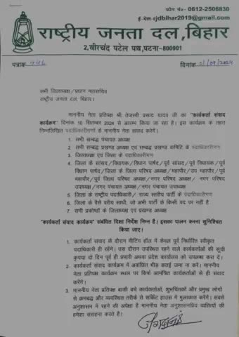 सभी जिलाध्यक्ष / प्रधान महासचिव राष्टरीय जनता दल, बिहार । माननीय नेता प्रतिपक्ष श्री तेजस्वी प्रसाद यादव जी का "कार्यकर्ता संवाद कार्यक्रम" दिनांक 10 सितम्वर 2024 से आरम्भ किया जा रहा है। इस कार्यक्रम के तहत निम्नलिखित पदाधिकारीगण